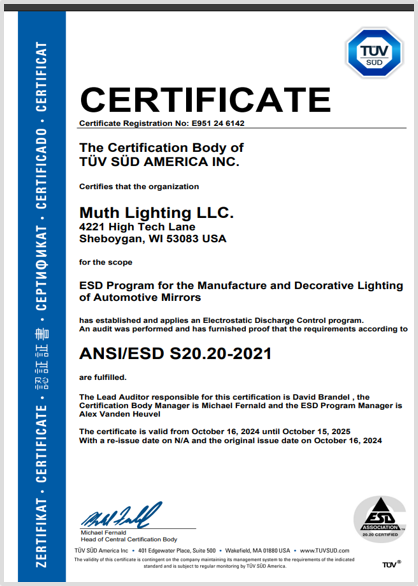 - Certified to ANSI/ESD S20.20-2021, Muth implements comprehensive ESD protection protocols to mitigate electrostatic risks across manufacturing processes